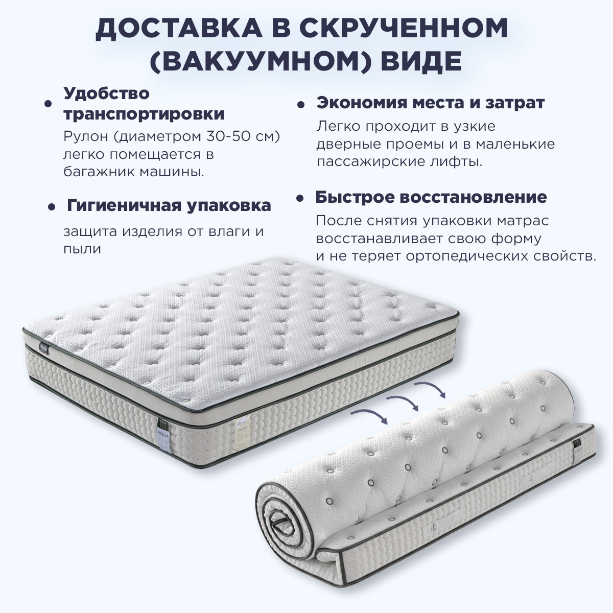 • ✓Умная доставка в вакуумной упаковке (roll pack): Главное удобство современности! Матрас поставляется свернутым в компактный рулон, что: