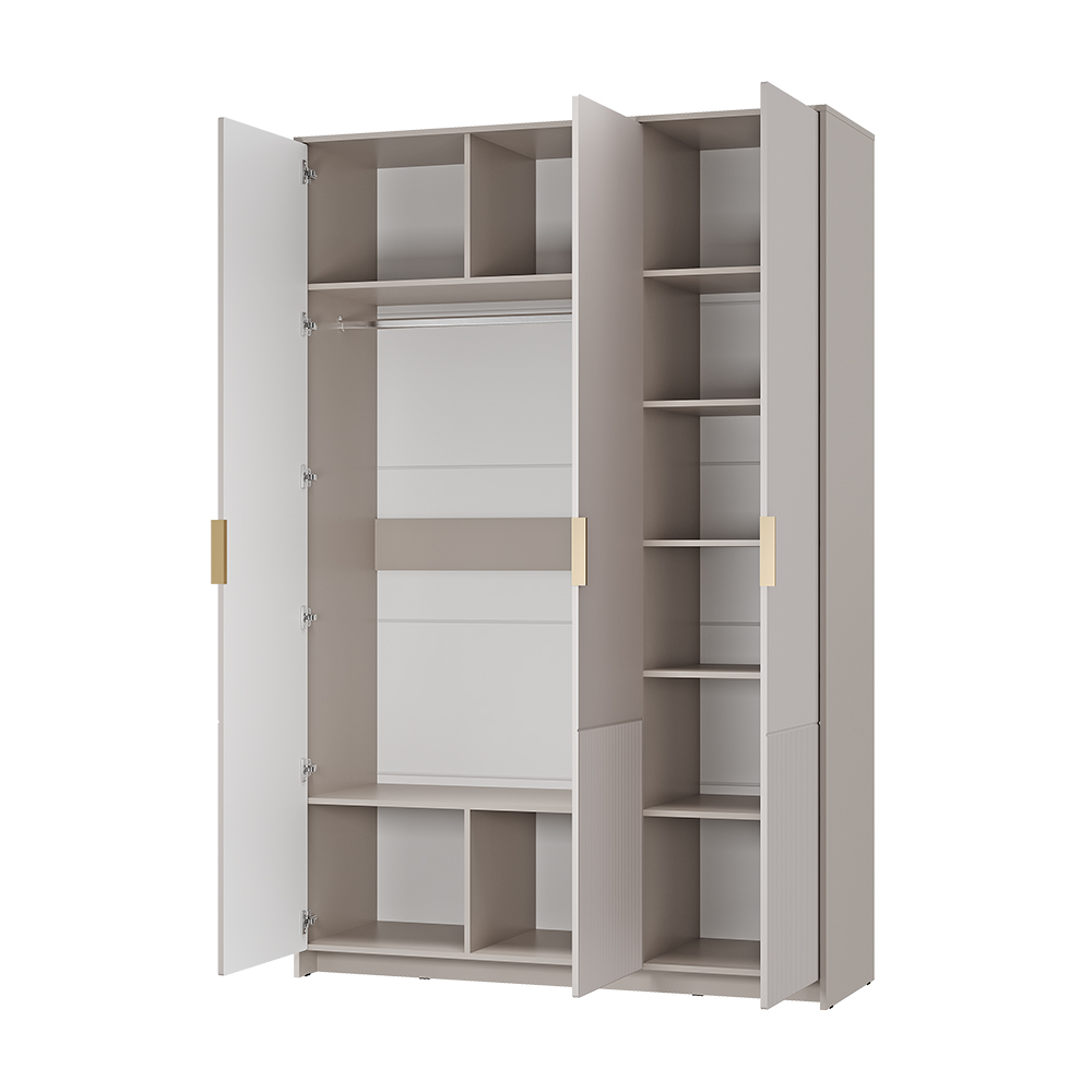 Трехстворчатый шкаф из коллекции «Пандора» создан для обладателей большого гардероба. Модель продумана до мелочей: здесь есть просторные полки для трикотажа и белья, удобный отсек для вертикального хранения и место для аксессуаров. Лаконичный дизайн в пастельных тонах («кашемир» и «айриш») подчеркнут элегантная фрезеровка и стильные ручки цвета пыльно-матового золота.